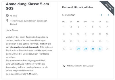 im Kalender unterhalb können Sie einen Termin zur Neuanmeldung für Klassenstufe 5 (vom 25. Februar bis 3. März 2026) buchen. Kommen Sie dann zur ausgewählten Zeit in die Bibliothek des SGS (E11). Eine Lehrkraft wird die Anmeldung vor Ort mit Ihnen durchgehen und abschließen.