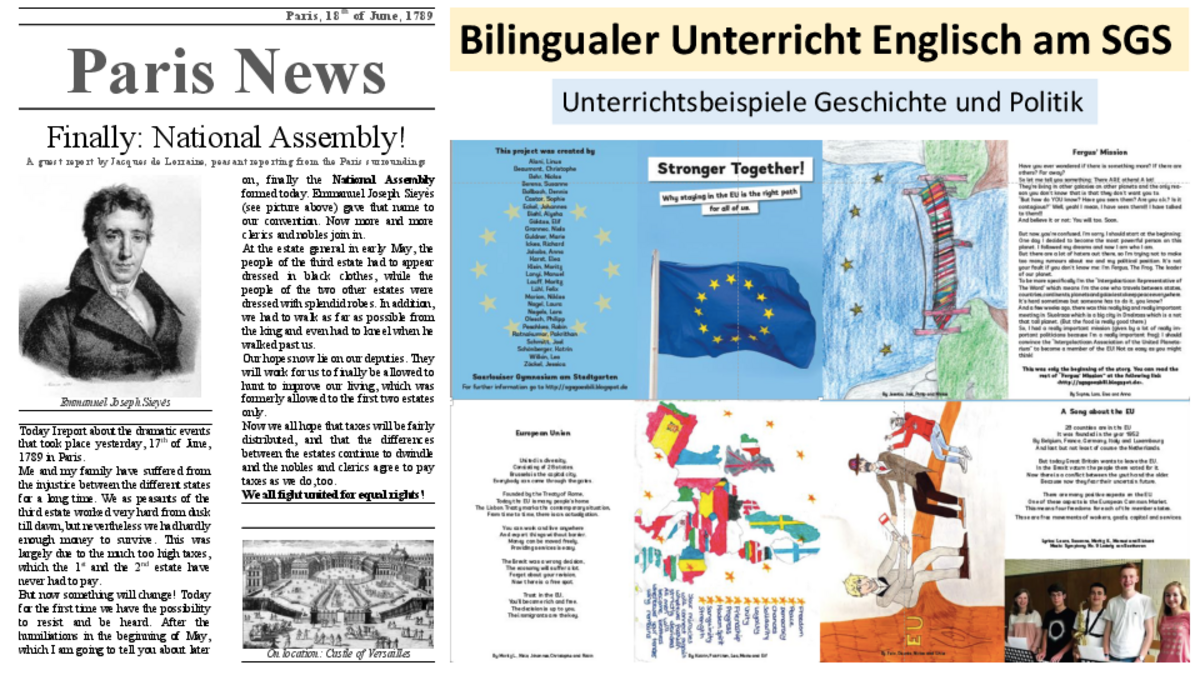 Da die saarländischen Lehrpläne Grundlage des bilingualen Unterrichts sind, stehen den Schülern die am SGS eingeführten deutschen Schulbücher des Fachs zur Verfügung. Ergänzt werden sie durch von uns erstellte Arbeitsblätter und Präsentationen unter Verwendung von authentischen Materialien in der Zielsprache Englisch.
