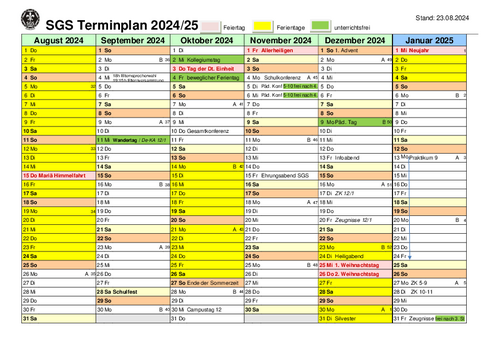 Der vorläufige Terminplan für das Schuljahr 2024/25 am SGS kann unterhalb als PDF-Datei heruntergeladen werden.