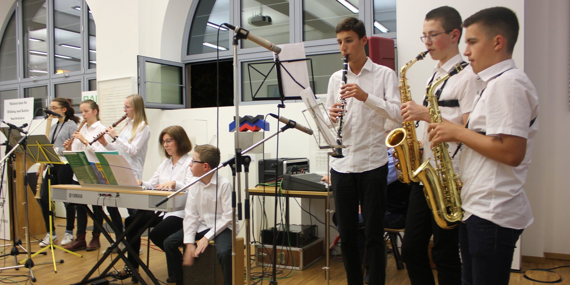 Hier musizieren zur Zeit Violinen, Blockflöten, Querflöten, Klarinetten, Saxophone,