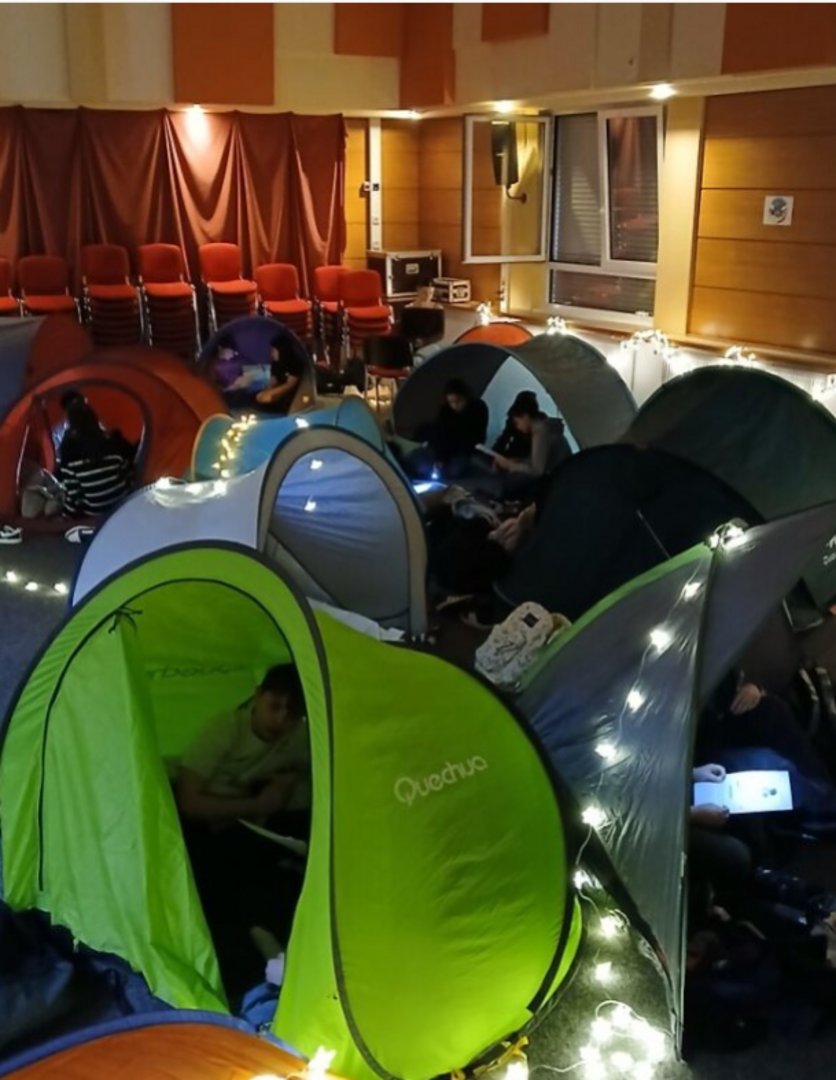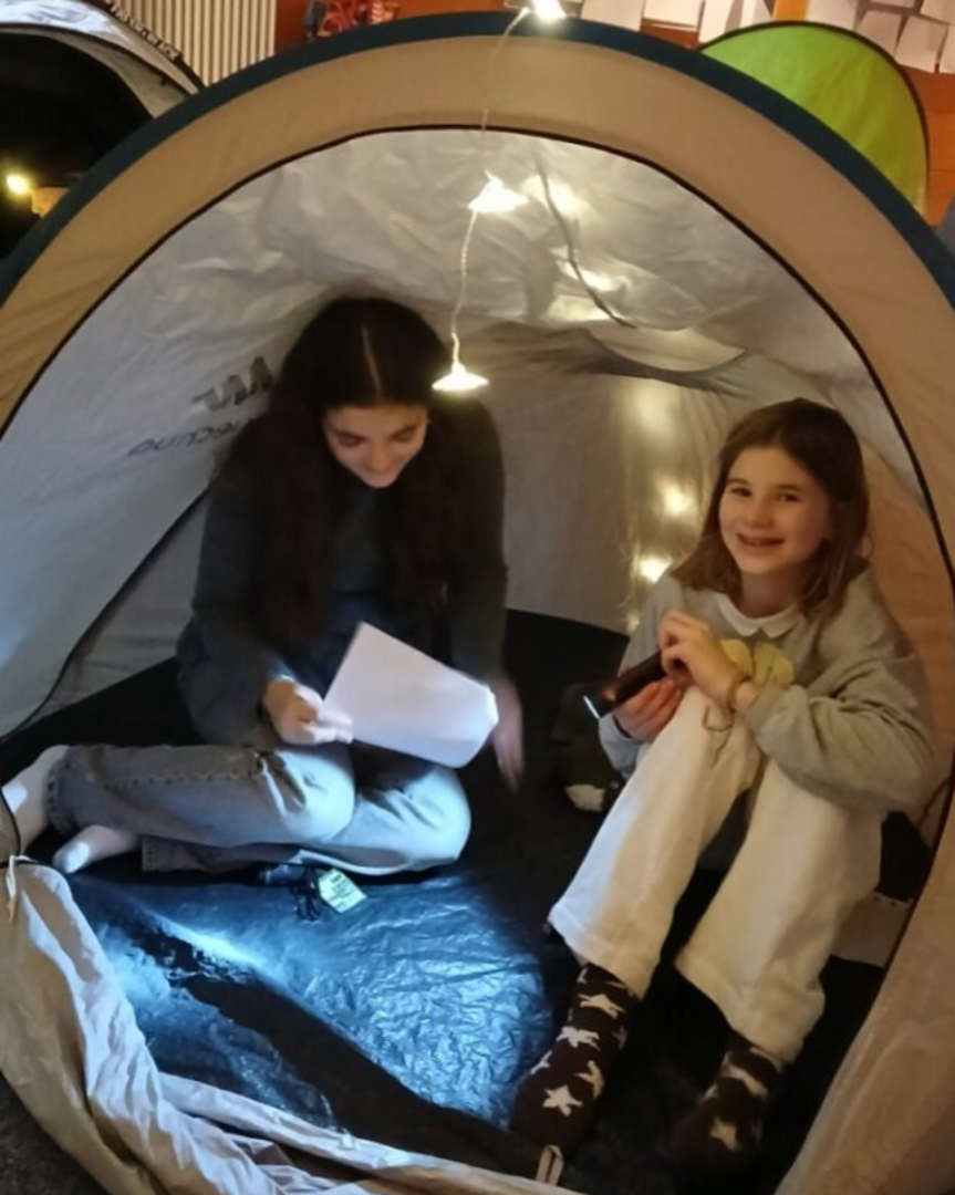 Danach durften die SchülerInnen dann mit ihren AustauschpartnerInnen ins „Zeltlager“: In der Aula waren zahlreiche Wurfzelte aufgestellt und mit Kissen und Decken behaglich ausgestattet worden. In gemütlicher Atmosphäre lasen die AustauschpartnerInnen gemeinsam eine deutsch-französische Geschichte.