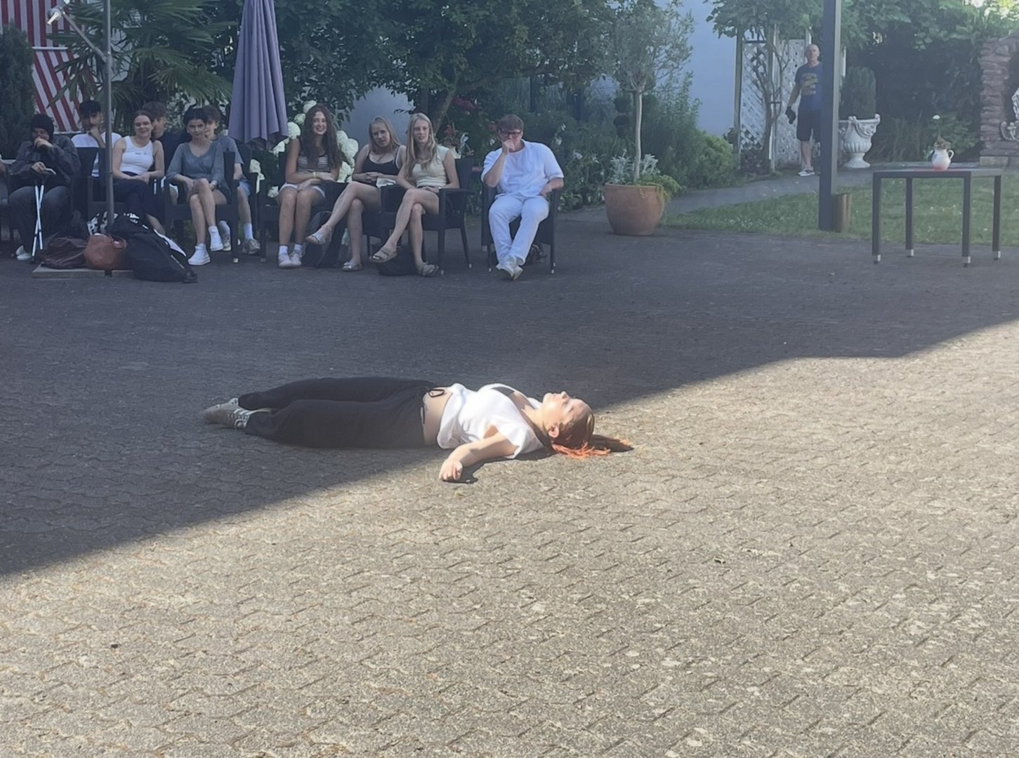Bei zwei Besuchen im Altenheim standen zunächst das Zuhören und der Austausch im Mittelpunkt. Die Jugendlichen hörten aufmerksam zu, stellten Fragen und ließen sich von den Erzählungen inspirieren. Nach intensiven Proben über einige Wochen im DS Unterricht präsentierten sie schließlich ihre Spielszenen direkt vor Ort im Garten des Altenheims am 30. Juni 2025.