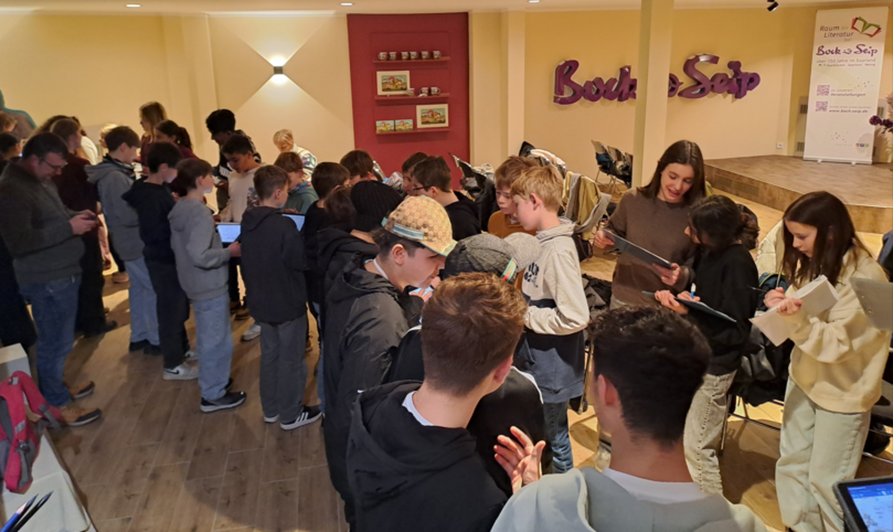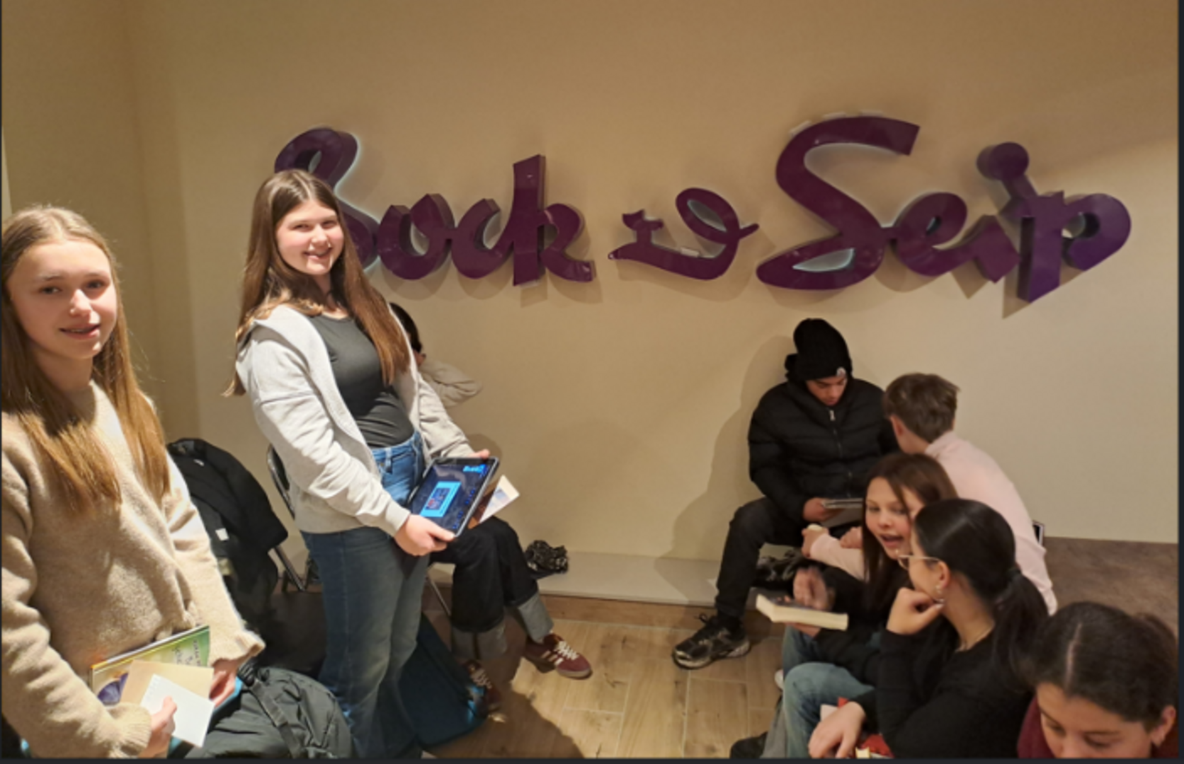 Nach einer kurzen Mittagspause, in der dann neben den beliebten französischen Crêpes auch noch internationale Spezialitäten probiert wurden, ging es in die Buchhandlung Bock und Seip in der Futterstraße. Da am 22. Januar in Frankreich ebenfalls die landesweite Leseaktion „Nuit de la lecture“ durchgeführt wird, durften wir im neu gestalteten Veranstaltungsraum im Untergeschoss der Filiale zahlreiche Aktivitäten rund um das Thema Lesen durchführen und uns mit dem AustauschpartnerInnen über unsere Lieblingsbücher austauschen. Vielen Dank an dieser Stelle an die Geschäftsführerin Dörte Heinrich und ihr Team, die uns die Räume zur Verfügung gestellt und uns herzlich willkommen haben!
