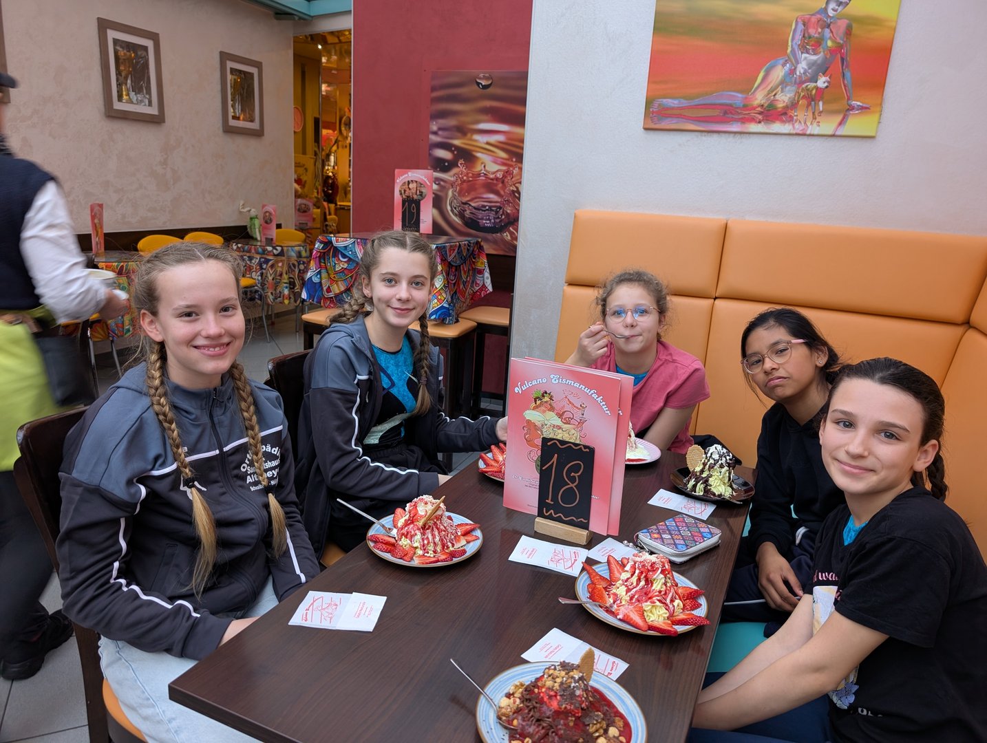 Am 05.03. nahm das Saarlouiser Gymnasium am Stadtgarten mit einer Mädchenmannschaft in der WK 3 bei Jugend trainiert für Olympia Gerätturnen in Dillingen teil. Beim Einturnen am Boden verletzte sich Libny leider am Fuß, Anna durfte glücklicherweise einspringen und hat eine schöne Bodenkür geturnt. Die Mannschaft zeigte auch an den anderen Geräten gute Leistungen und konnte am Schwebebalken deutlich bessere Leistungen als im letzten Jahr zeigen. Da wir im 1.Durchgang geturnt haben, hatten wir danach noch etwas Zeit bis zur Siegerehrung. Wir sind dann gemeinsam ein Eis essen gegangen und auf den Spielplatz neben der Sporthalle. Libny wurde hierbei abwechselnd von uns getragen.
