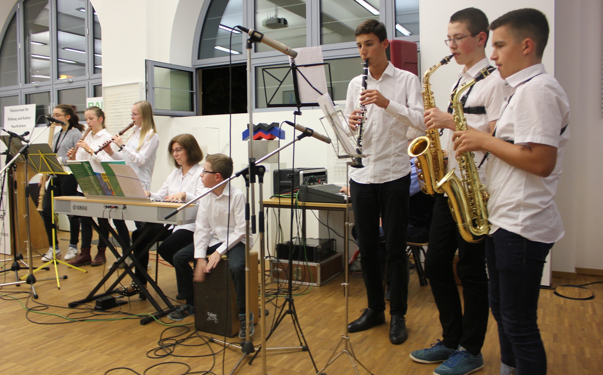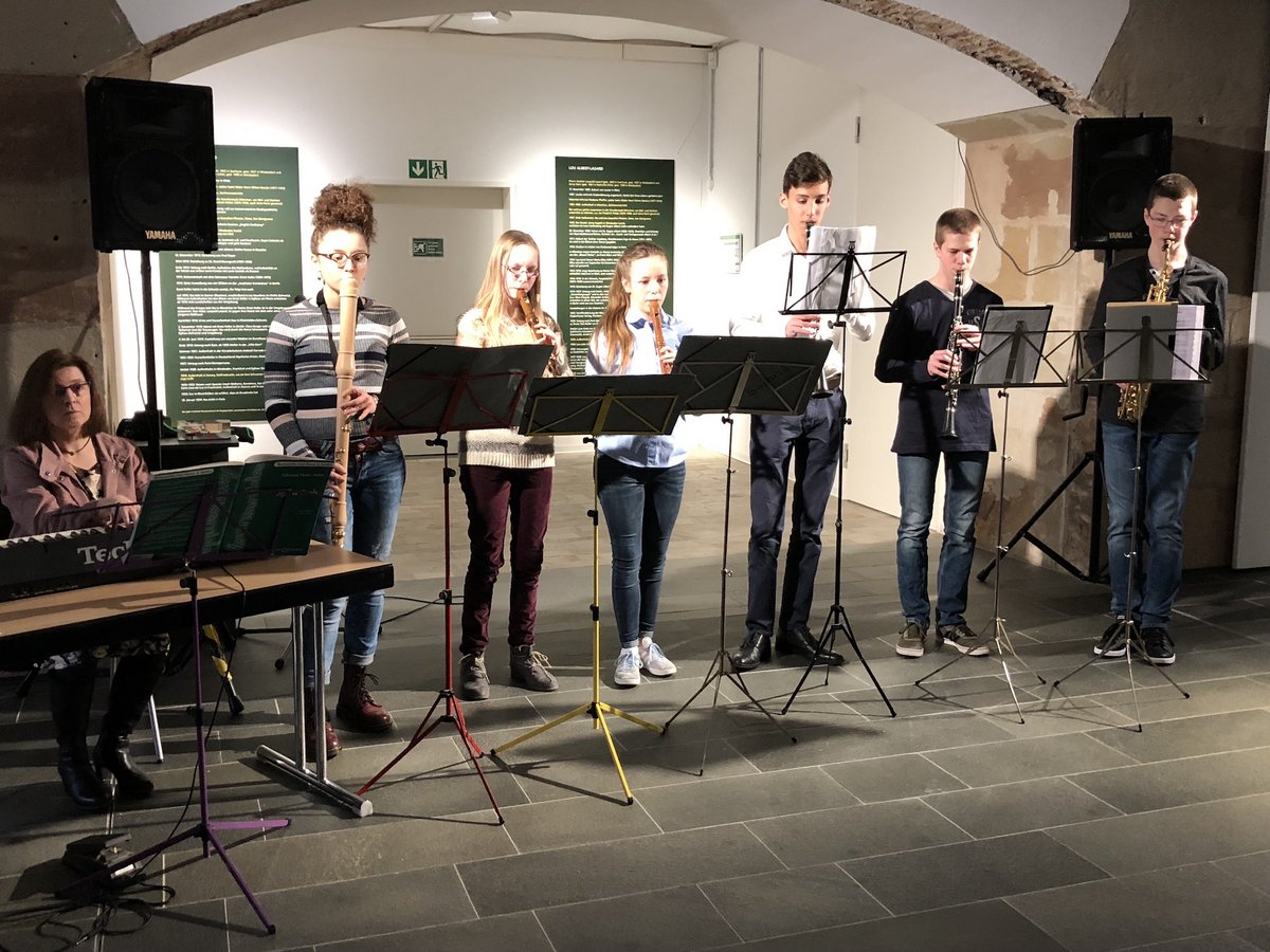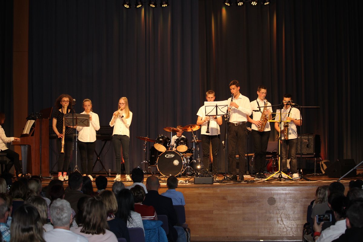 Hier musizieren zur Zeit Violinen, Blockflöten, Querflöten, Klarinetten, Saxophone,